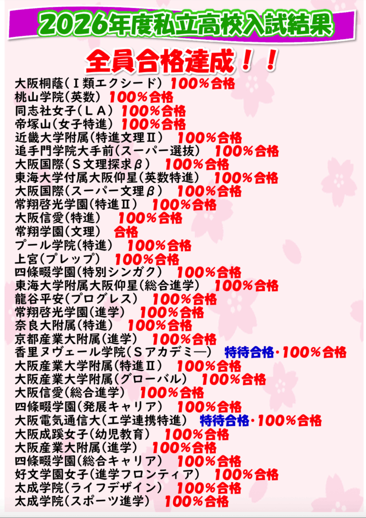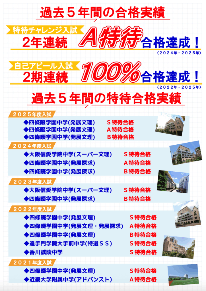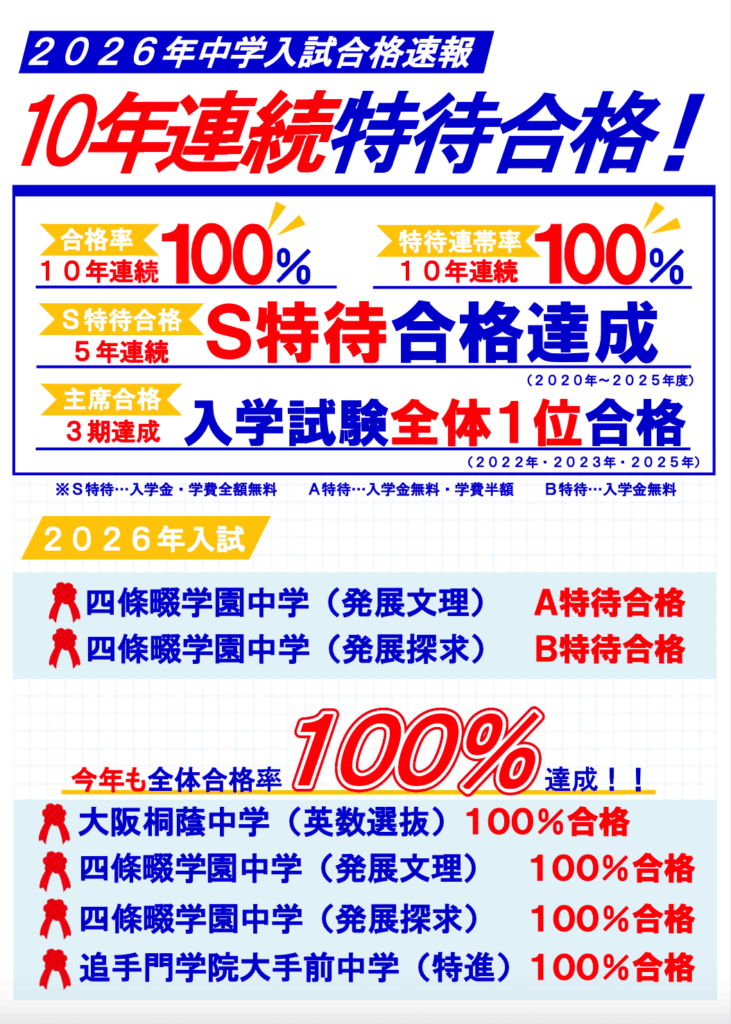 公立、私立それぞれの目的によって、異なる内容を小学生の頃から学べるカリキュラム。四條畷学園中学やその他の私立中学入試対策にも力を入れ、毎年高い合格率を維持しています!